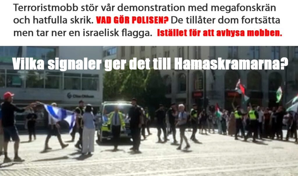 Terroristmobb stör vår demonstration 31/8 på Gustav Adolfs Torg i Malmö med megafonskrän och hatfulla skrik. VAD GÖR POLISEN? De tillåter dom fortsätta men tar ner en israelisk flagga. Istället för att avhysa mobben.