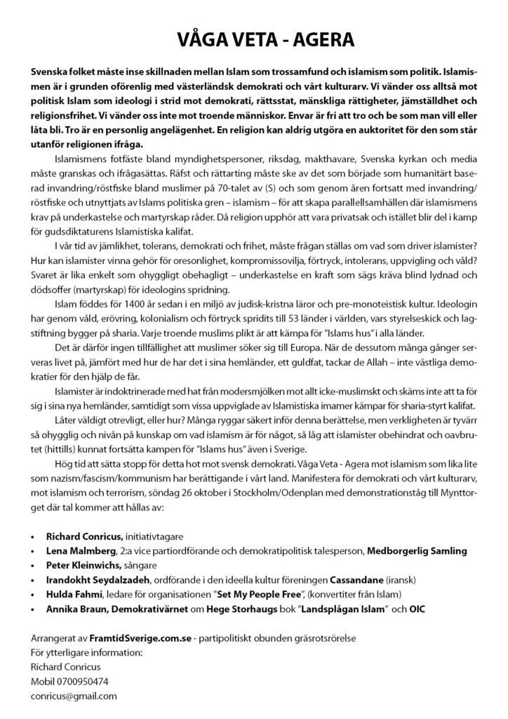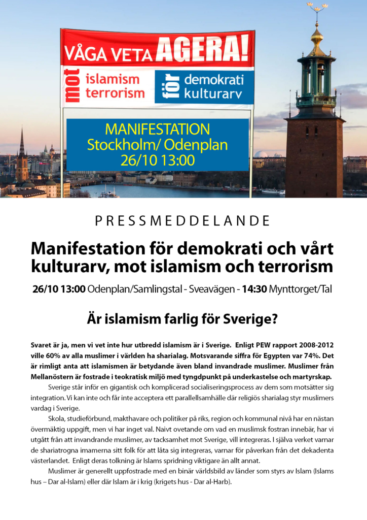 Hög tid att sätta stopp för eländet. Våga Veta – Agera mot islamism som lika lite som nazism/fascism har berättigande i vårt land. Manifestera för demokrati och vårt kulturarv, mot islamism och terrorism, söndag 26 oktober i Stockholm/Odenplan 13-16.