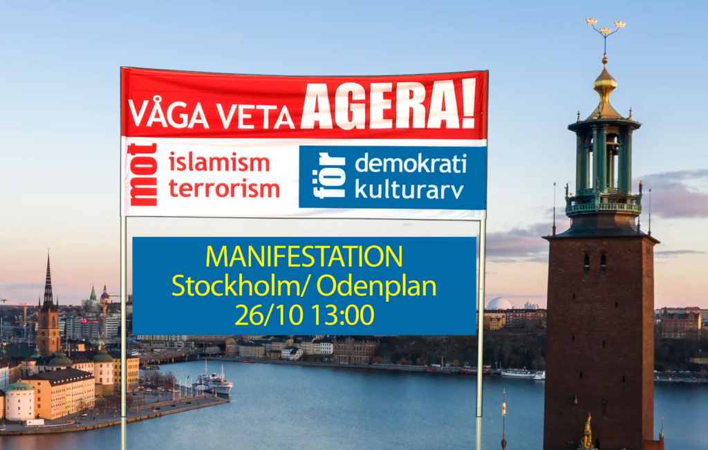 Manifestera för demokrati och kulturarv, mot islamism och terrorism 26/10 13:00, Stockholm/Odenplan med demonstrationståg till Mynttorget där tal kommer att hållas.